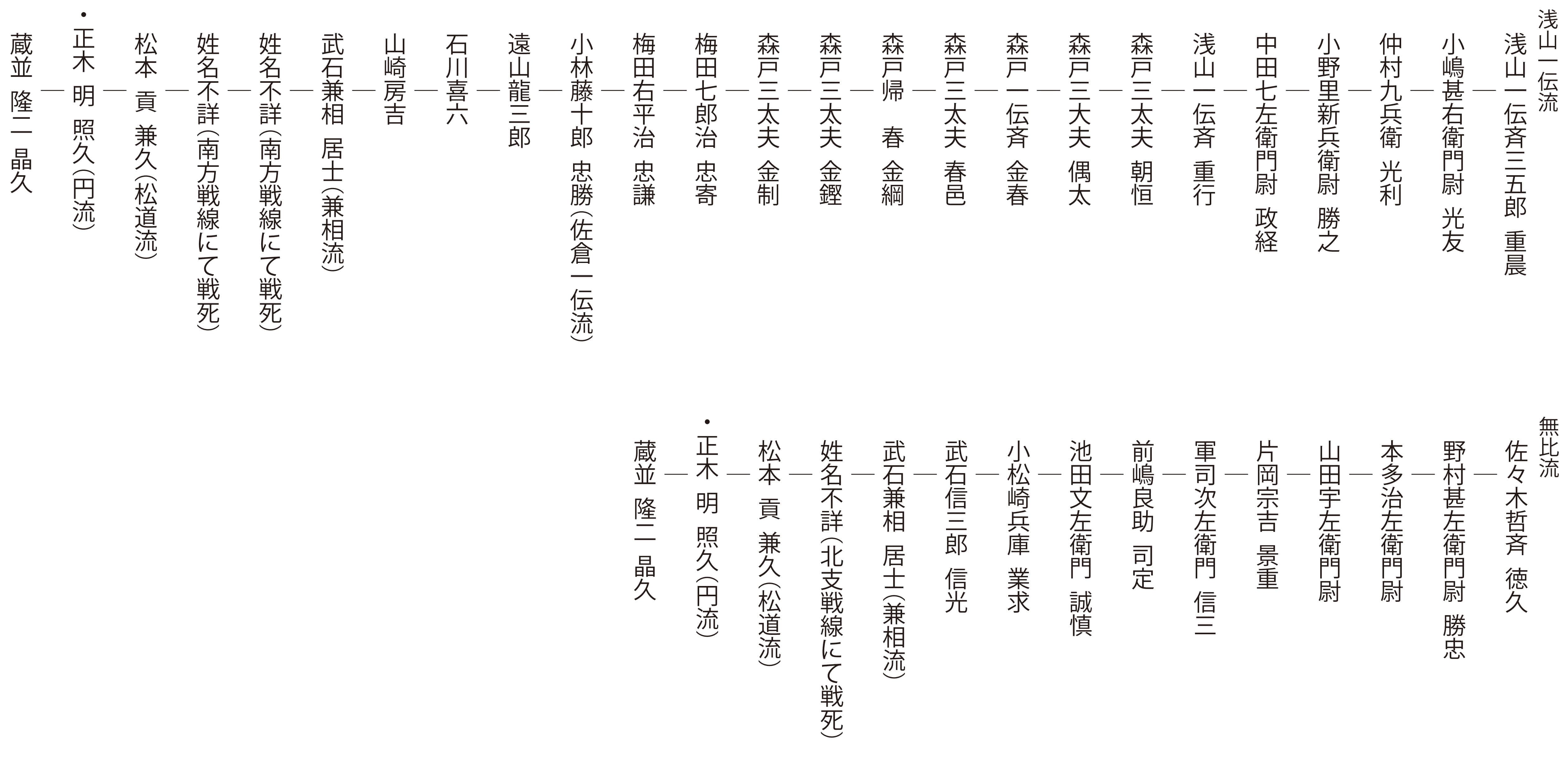 年月日は忘れましたが、某日兄弟子の鈴田芳雄氏と松本貢先生を訪問。いろいろと歓談中、鈴田氏が「……系譜を見ると浅山一伝流は二名、無比流には一名欠落しているので先生は浅山一伝流は二十一世、無比流は十二世になる」のではないかと、たずねた所、松本先生、答えて曰ク、戦争中のある日、武石兼相先生を訪門した所、三日前表記の三人が北支より呉軍港に至りこれから南方方面に出動とのこと、一人は陸軍省に出頭し北支に、とのことをきき、これが最後の日になるやもと、二人に浅山一伝流二十一世、二十二世の印可を授け(二人は東京出身)もう一人は茨木の人でその人は父、祖父の代から無比流の習得に励んで居られ、これから茨木に向かうとのことで、「では、」と無比流十二世の印可を授けたとのことです。その後、三人の戦死を知らされ、暗然と浜松の晴れた空を見上げたのを覚えているそうです。