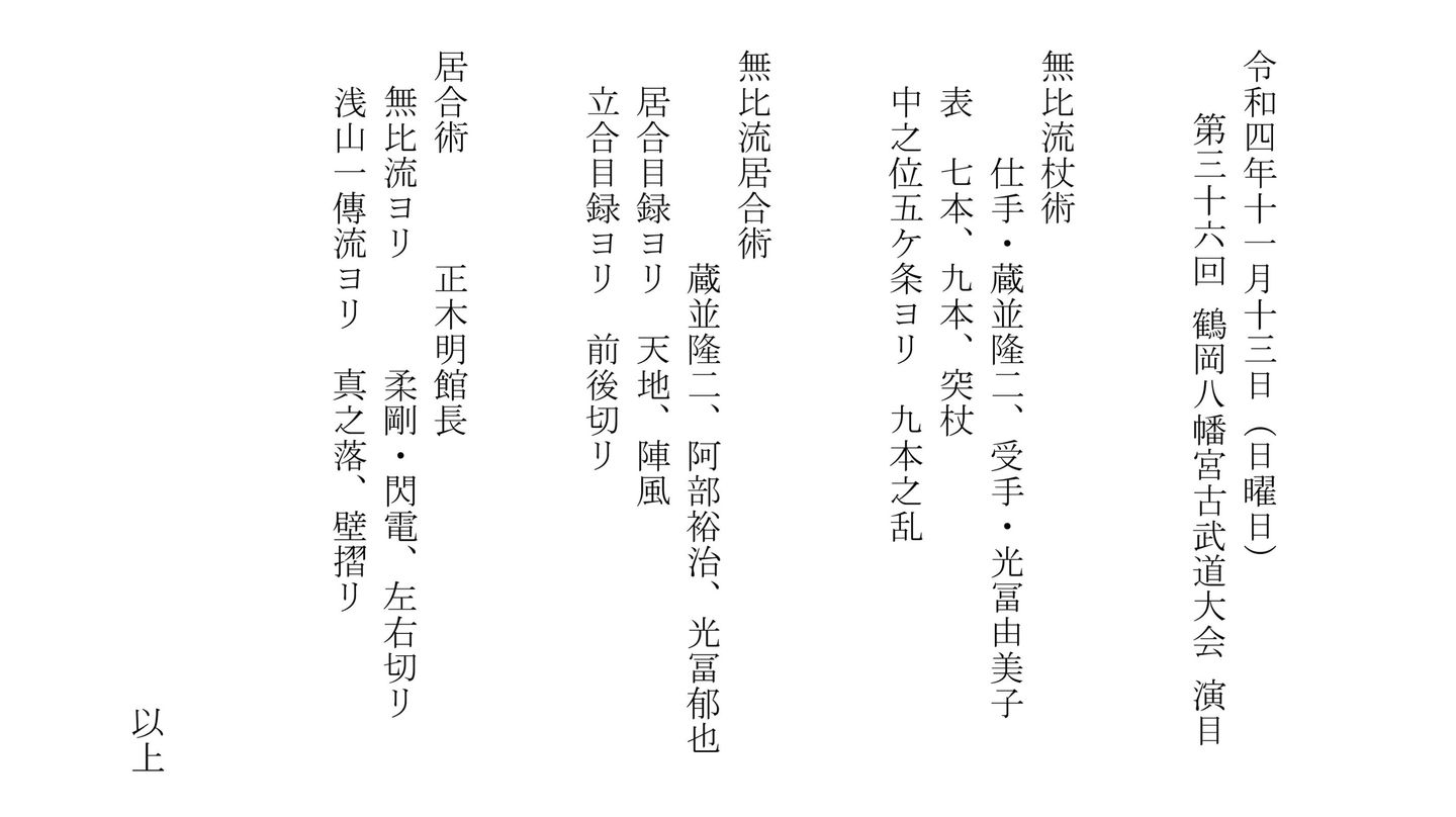 令和四年十一月十三日(日曜日) 第三十六回 鶴岡八幡宮古武道大会 演目