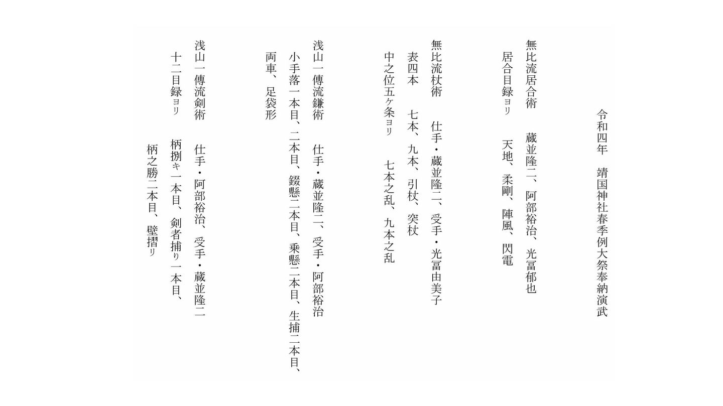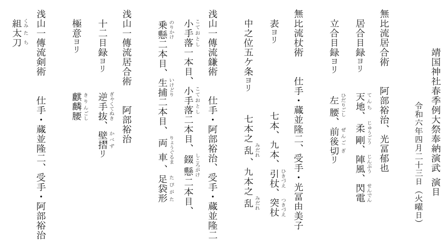 | 2024/4/27 | 靖国神社春季例大祭奉納演武 演目を公開しました。令和六年四月二十三日(火曜日) |