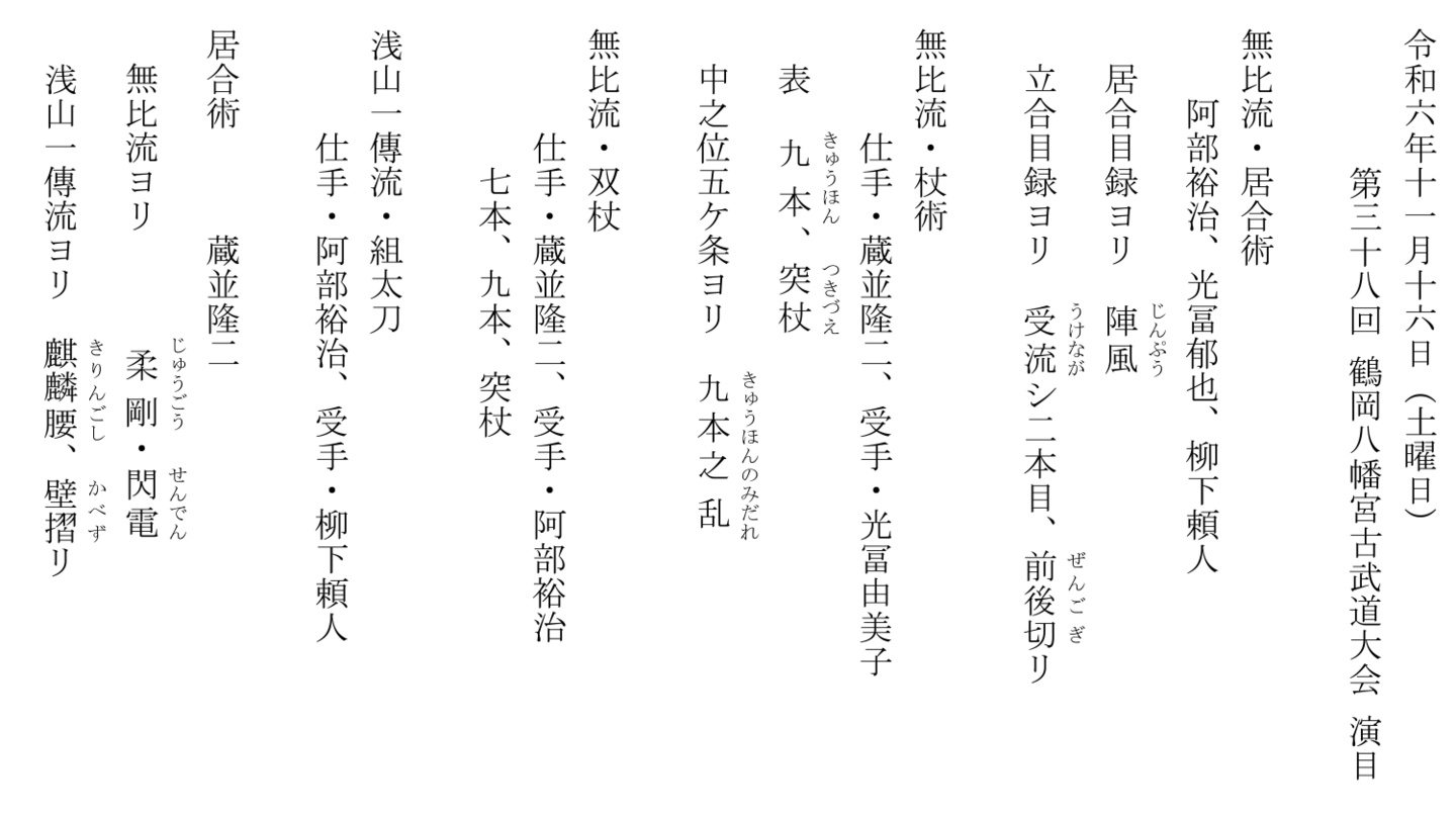令和六年十一月十六日(土曜日) 第三十八回 鶴岡八幡宮古武道大会 演目